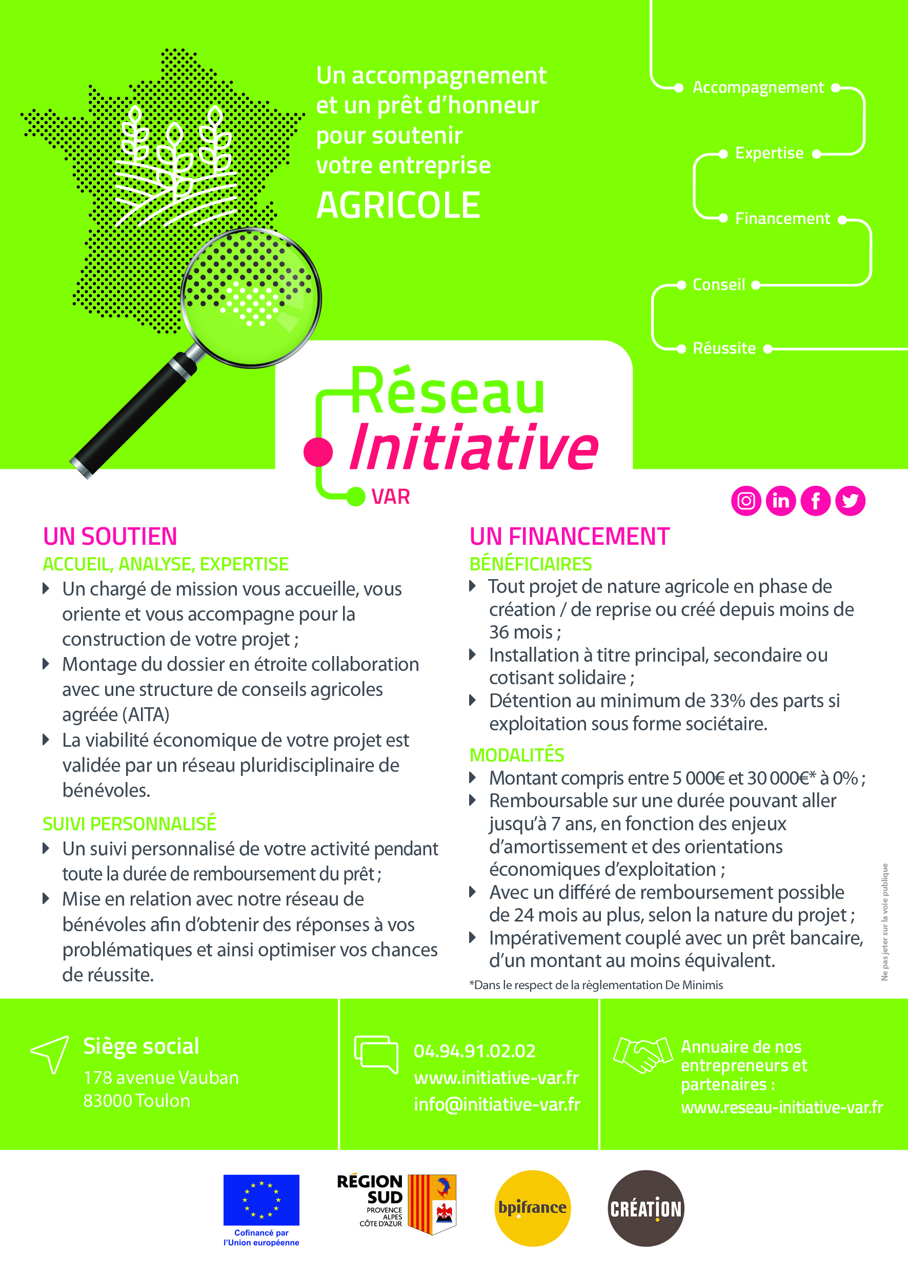 Initiative Var propose le Prêt d'Honneur Agricole pour soutenir la création et la reprise d'une exploitation agricole.